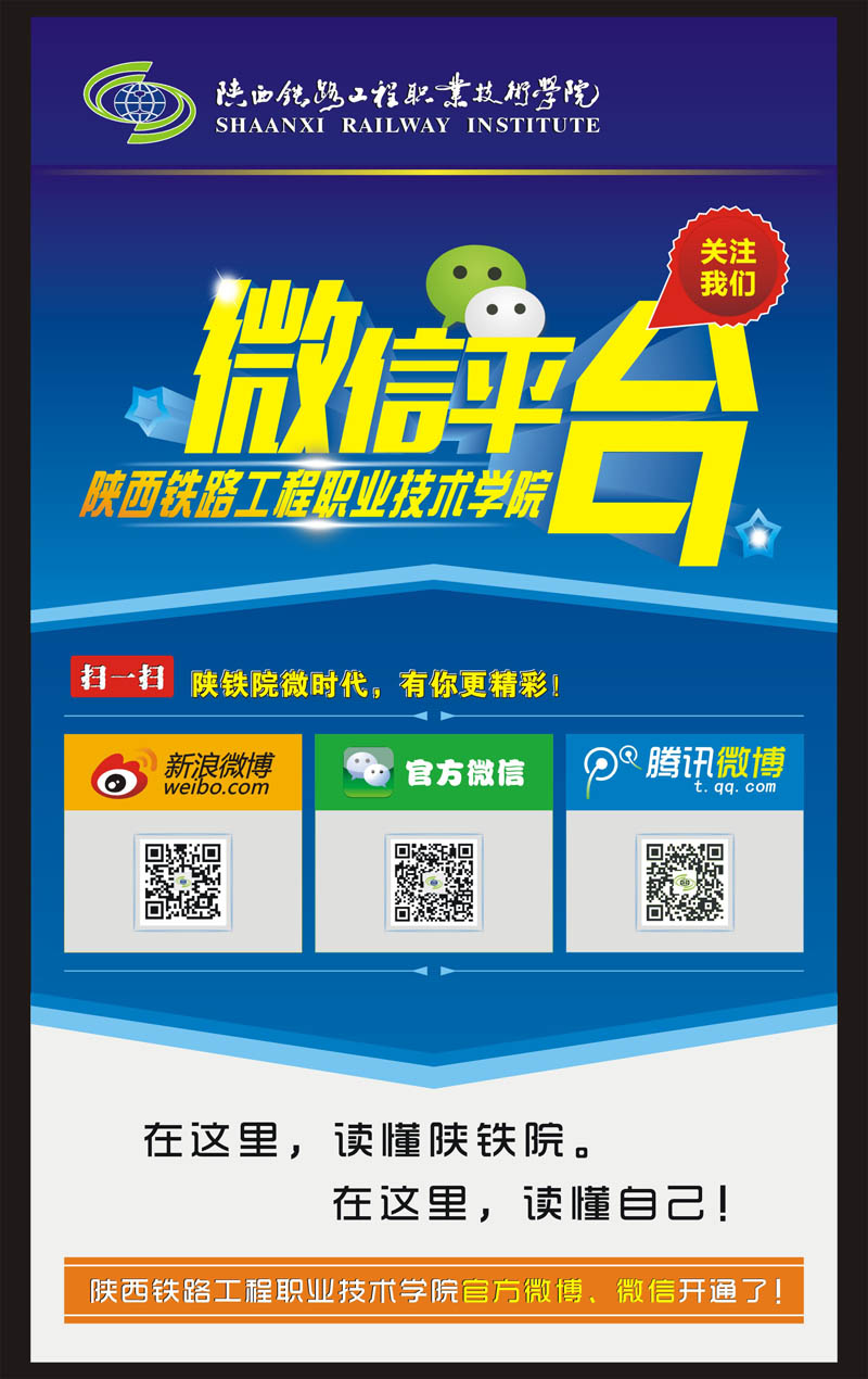 为适应新媒体发展的需要,推动校园传统媒体与新兴媒体的融合,更好地传播校园资讯,近日,陕铁院官方新浪微博和公众微信平台正式上线。