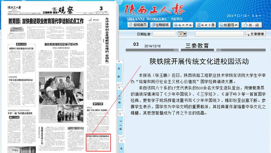 陕铁院开展传统文化进校园活动 本报讯(张玉鹏)近日,陕西铁路工程职业技术学院在该院大学生中举办“培育和践行社会主义核心价值观”国学经典诵读大赛。 来自该院八个系的17支代表队的500余名大学生逐队登台,用慷慨激昂的诵读深情演绎了《少年中国说》、《三字经》、《游子吟》等一首首国学经典,更有学子现场挥毫泼墨书写《少年中国说》,精彩纷呈创意不断。参赛学生表示,国学作为中华文明的重要载体,其经典著作凝缩着中华文化之精髓,其思想智慧成为了传之千古的结晶。