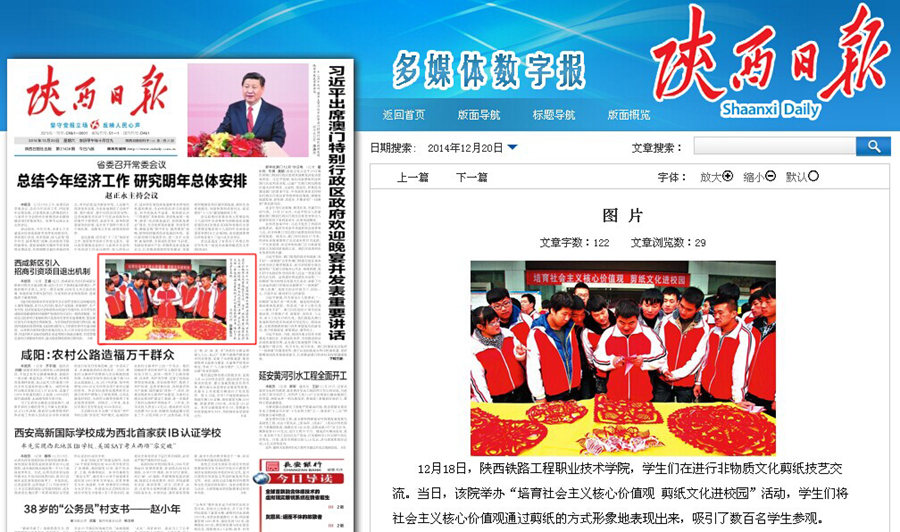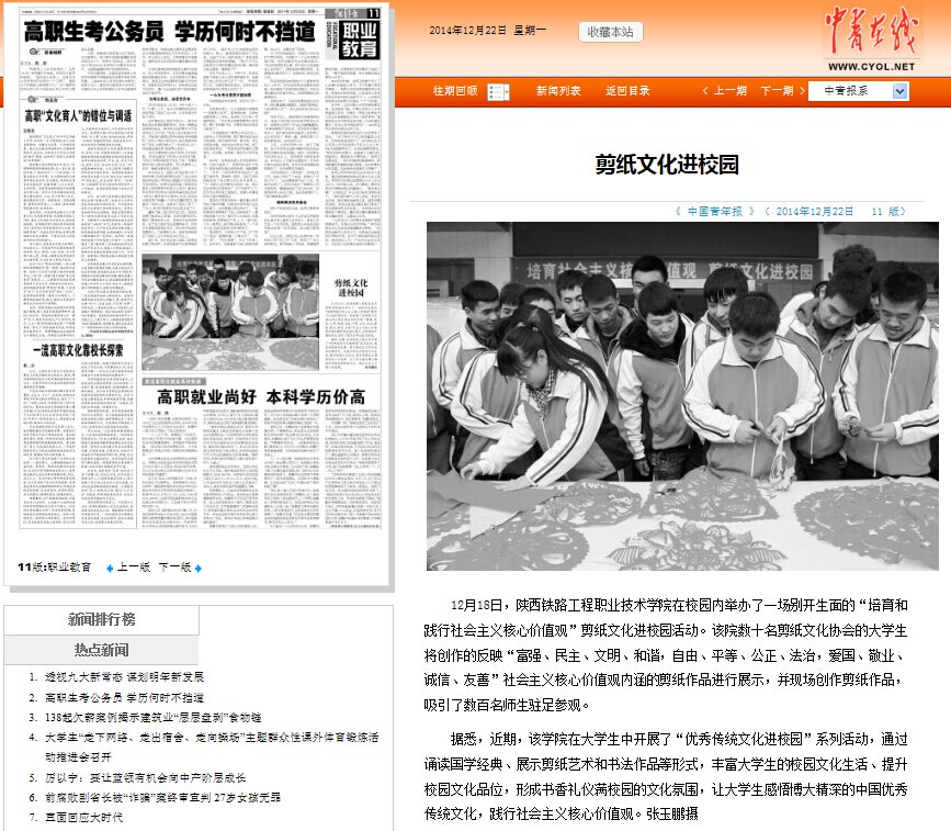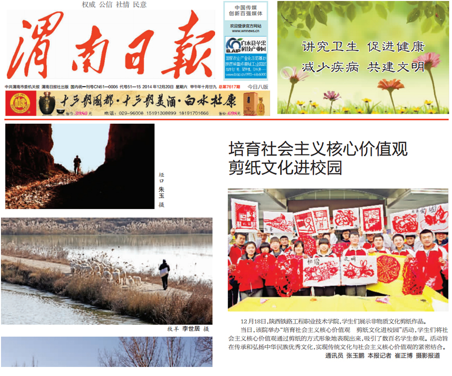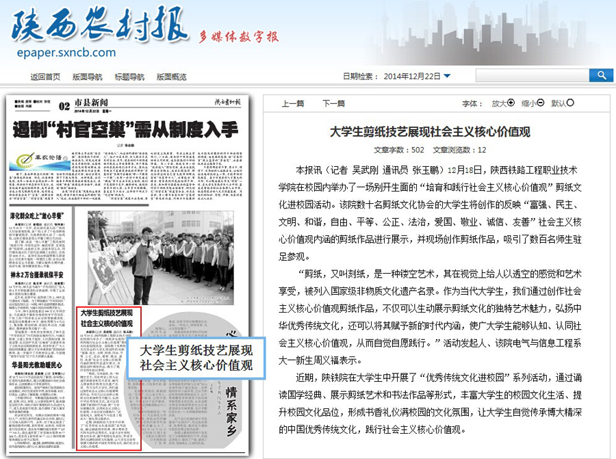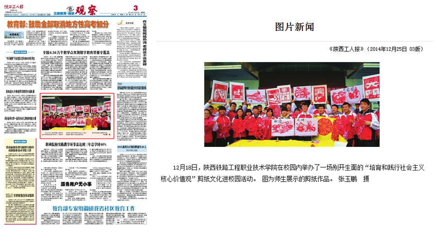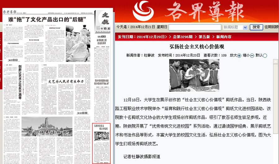 12月20日,《陕西日报》在头版位置处,对学院电气与信息工程系主办的“培育社会主义核心价值观”剪纸文化进校园主题活动进行了报道。12月22日,《中国青年报》职业教育版也以“剪纸文化进校园”为题,对此项活动进行了报道。此外,《各界导报》、《陕西农村报》、《陕西工人报》、《渭南日报》、新华网、陕西传媒网、陕西省教育厅官方微博等数十家中省市主流媒体也分别进行了专题报道。现将全文转载如下,欢迎大家点击浏览。(党委宣传部)