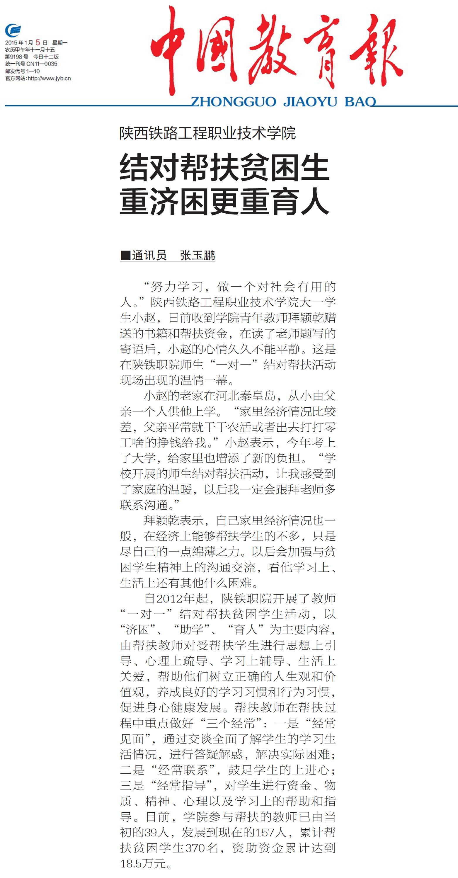 1月5日,《中国教育报》第7版以“陕铁院:结对帮扶贫困生 重济困更重育人”为题,对学院开展教师“一对一”结对帮扶贫困学生活动进行了专题报道。 人民网、腾讯网、中国网、中国广播网、陕西人民广播电台等多家媒体也给予了关注报道。现将全文转载如下: