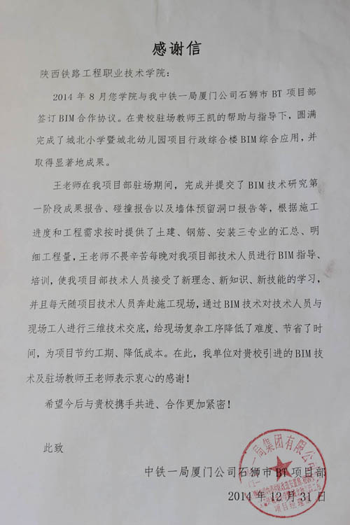 日前,学院与中铁一局厦门公司签订的石狮安置房项目BIM技术应用研究顺利结题,其获得了公司领导和项目部的一致好评。 BIM技术在该项目的应用,不但提高了项目管理及技术人员的工作效率,并且通过管线综合优化,材料、质量及安全管理等工作,实现了缩短工期、节约成本的目的。BIM技术项目顺利完工后,中铁一局厦门项目部为驻场教师举行欢送仪式,并发来感谢信。(马少雄) 感谢信