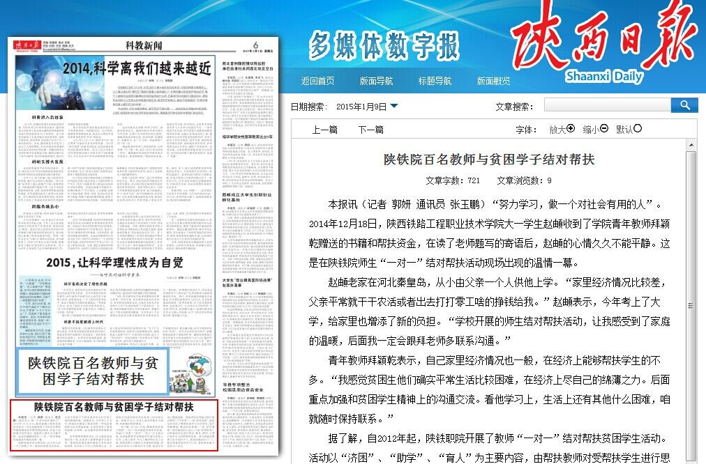 2015年1月9日陕西日报第6版题:陕铁院百名教师与贫困学子结对帮扶