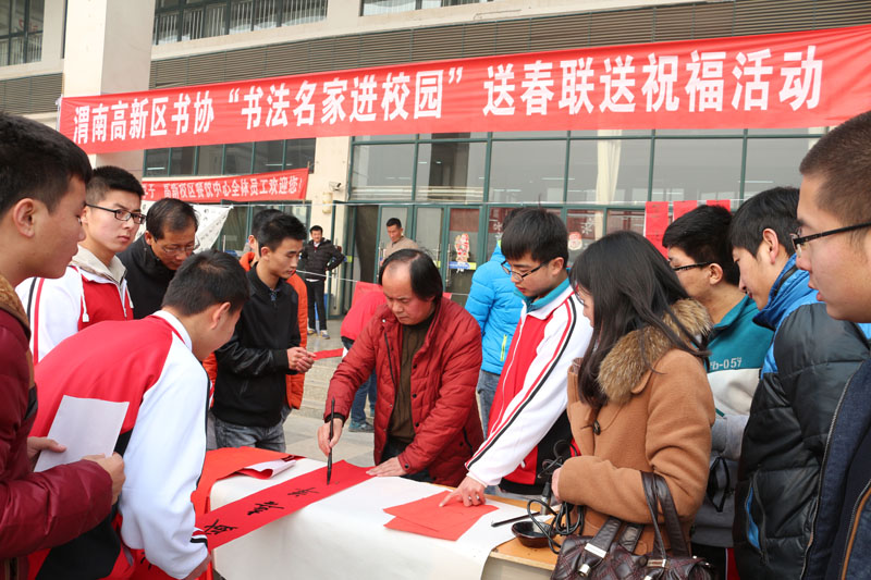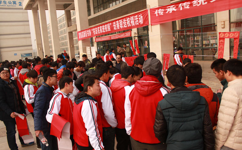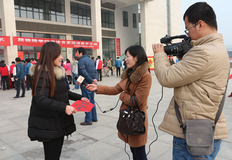 渭南高新区书法家协会主席陈龙在接受渭南电视台记者采访时谈到:传承中国传统文化,弘扬书法艺术,是书法家协会的重要职责,通过书法走进大学校园、开展送春联送祝福活动,与陕铁院搭建友谊的桥梁,也为陕铁院师生送去节日最美好的祝福;铁工系学生张劲松同学表示:能将书法家写的对联带回家非常高兴,比起那些买来的春联更加有意义!”学院团委书记黄新静谈到:通过此次活动,让广大陕铁院师生近距离感受到了书法家的风采,增强了对中国传统文化及精神的了解和弘扬。是陕铁院贯彻落实十八大关于加强中华优秀传统文化传承的具体举措之一,也是陕铁院校园文化建设的重要载体之一。(毛俊杰、欧阳莎/文 毛俊杰/图)