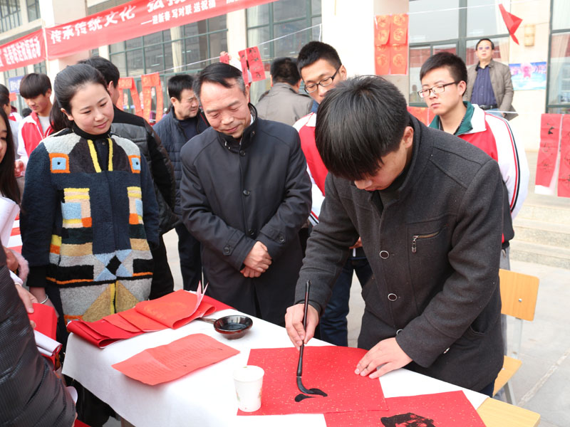 过年贴对联是中华民族的古老传统,它象征着吉祥如意,表达着人们向往美好生活的民族风俗。为了迎接羊年的到来,1月14日,由陕铁院团委、渭南高新区书法家协会主办,铁道工程系等四个系部共同承办的“迎新春,写春联,送祝福”活动在高新校区餐厅前广场隆重举行。学院党委副书记车绪武,渭南高新区党群工作部副部长陈立,渭南高新区书法家协会主席陈龙,院学生处处长亢新河、团委书记黄新静、各系部书记等人来到活动现场,观赏了渭南高新区书法家协会书法家和学院“墨梅斋”书画协会会员的现场创作。渭南电视台记者进行了现场报道。