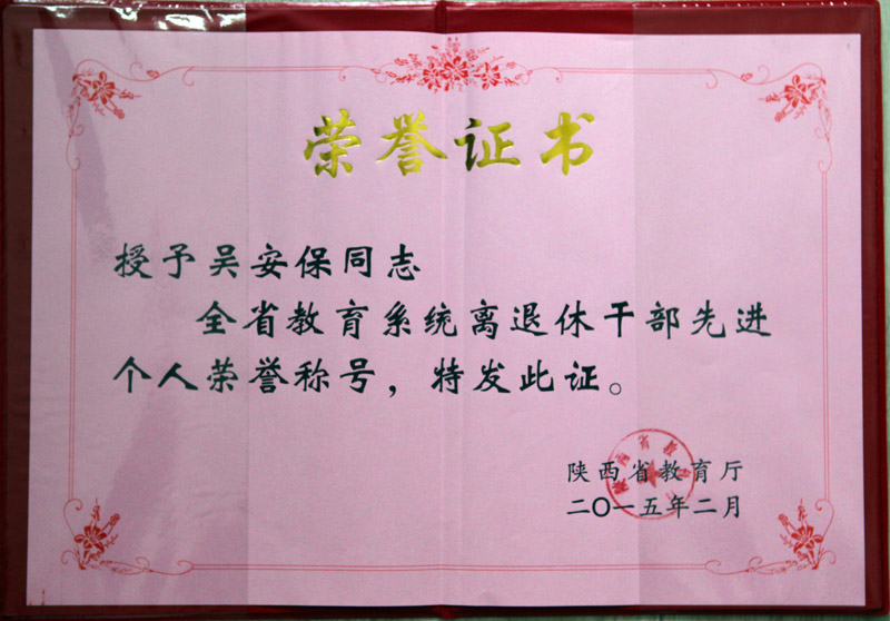3月26日上午,陕西省教育系统离退休干部先进集体和先进个人表彰及2015年工作布置会在省教育厅一楼会议室召开。学院退休教师吴安保同志喜获全省教育系统离退休干部先进个人荣誉称号。 省委高教工委副书记、省教育厅厅长李兴旺在会上作了讲话,要求全省教育系统创新机制,切实加强制度和干部工作队伍建设。会议由省教育厅常务副厅长梁宝林主持。(张威/文 苏显文/图) 荣誉证书