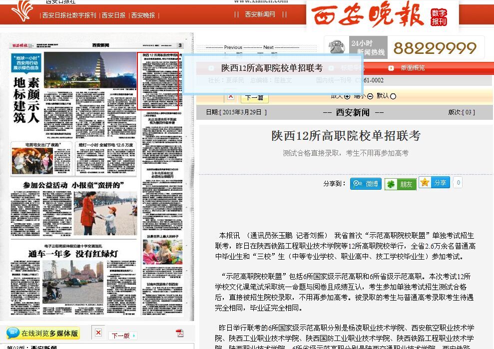2015年3月29日西安晚报第3版题:陕西12所高职院校单招联考