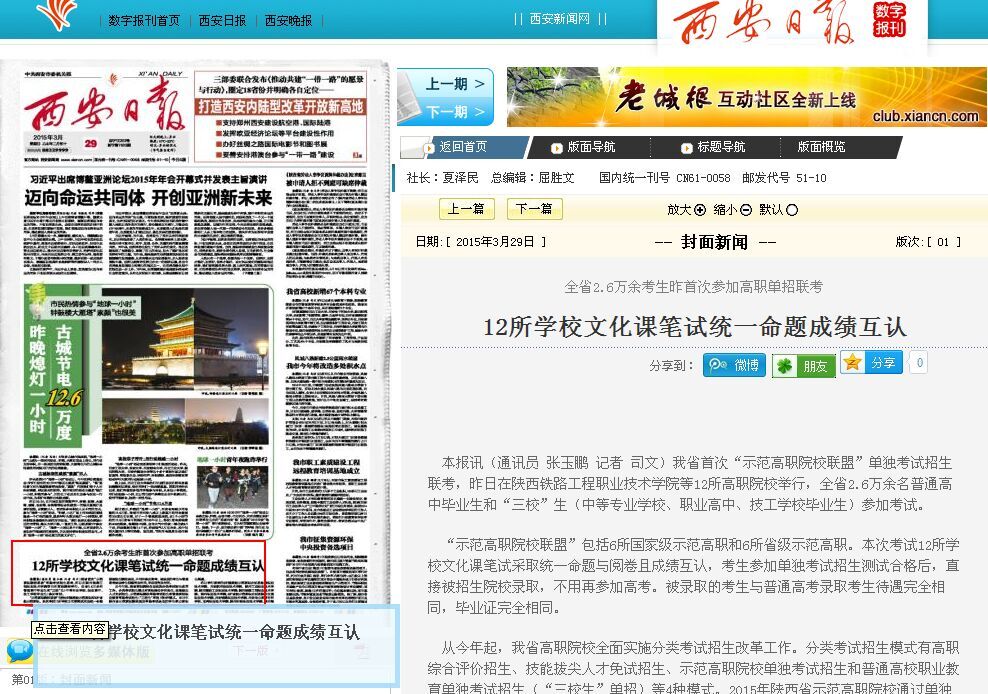 2015年3月29日西安日报头版题:全省2.6万考生昨首次参加高职单招联考