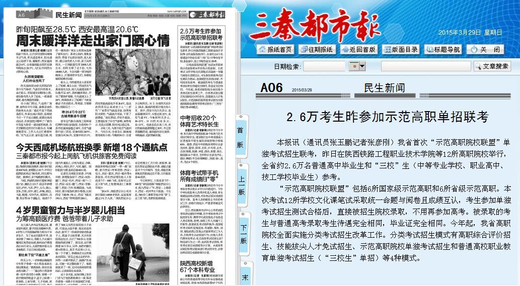 2015年3月29日三秦都市报第6版题:2.6万考生昨参加示范高职单招联考