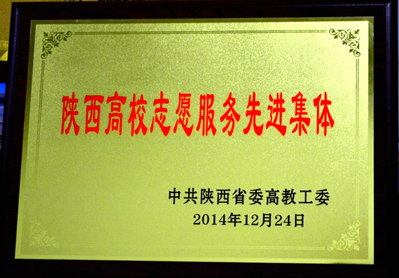 4月1日,全省普通高校学工部长、团委书记工作会议在西安工业大学召开,省高教工委副书记郝利生、省高教工委学工部部长田民正、省高教团工委书记郭强出席会议。会议表彰了陕西省普通高校辅导员队伍建设先进单位和陕西高校志愿服务先进集体。学院团委书记黄新静代表学院上台领取“陕西高校志愿服务先进集体”奖牌。会上,郝利生书记还就全省高校2014年度学生思想政治工作及共青团工作进行了总结,整体部署了2015年工作。学院学工部部长、团委书记参加了会议。(黄新静) 荣誉奖牌