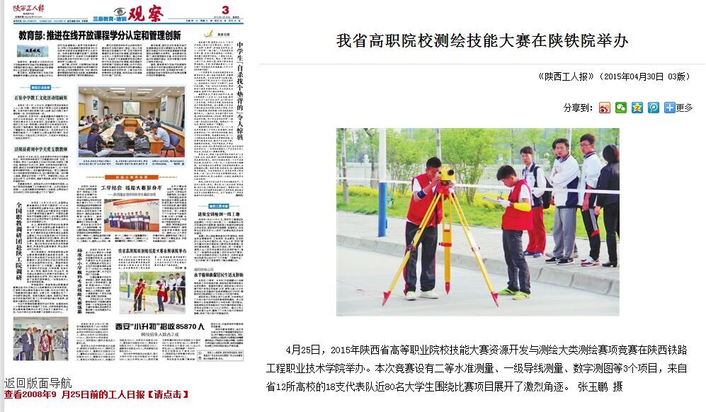2015年4月30日陕西工人报第3版题:我省高职院校测绘技能大赛在陕铁院举办