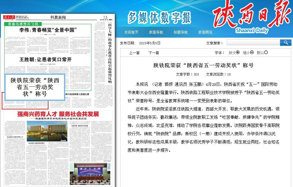 2015年5月5日陕西日报第13版题:陕铁院荣获“陕西省五一劳动奖状”称号
