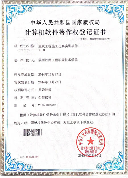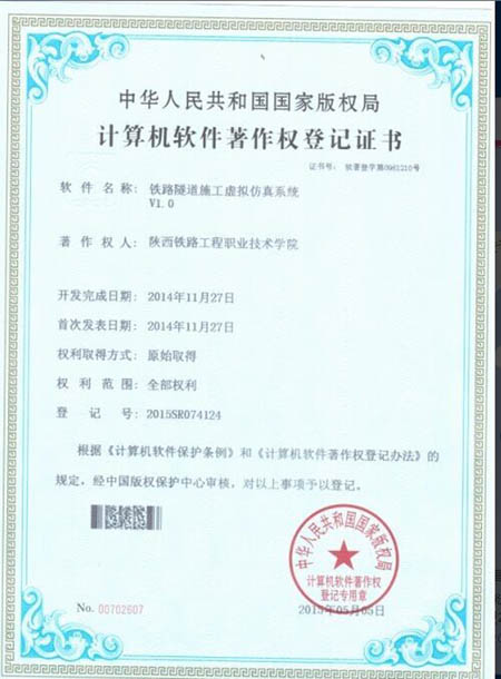 近日,学院建筑工程施工仿真实训软件V1.0和铁路隧道施工虚拟仿真系统V1.0获得中华人民共和国国家版权局颁发的计算机软件著作权登记证书。