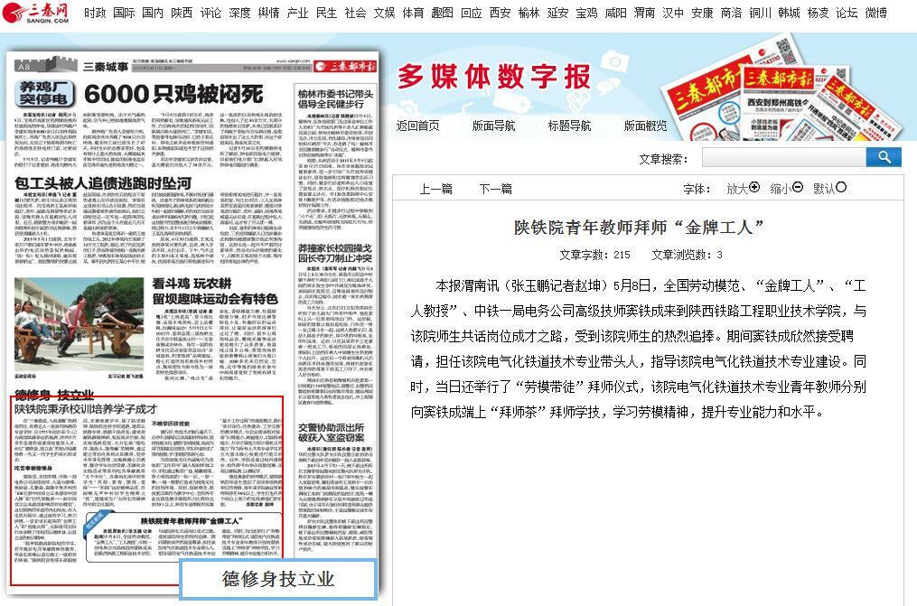 2015年5月11日三秦都市报第8版题:陕铁院青年教师拜师“金牌工人”