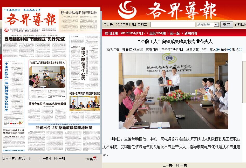 5月8日,全国劳动模范、中铁一局电务公司高级技师窦铁成来到陕西铁路工程职业技术学院,受聘担任该院电气化铁道技术专业带头人,指导该院电气化铁道技术专业建设。 窦铁成被誉为“金牌工人”、“工人教授”,是新中国成立以来100位感动中国人物。他从一个只有初中文化水平的普通工人,通过自身不断地努力学习,刻苦钻研,学中干、干中学,最终成长为掌握高超技能的专家型技术工人。他的团结互助、乐于奉献的团队精神,被誉为“铁成精神”。 记者杜静波 通讯员张玉鹏摄影报道