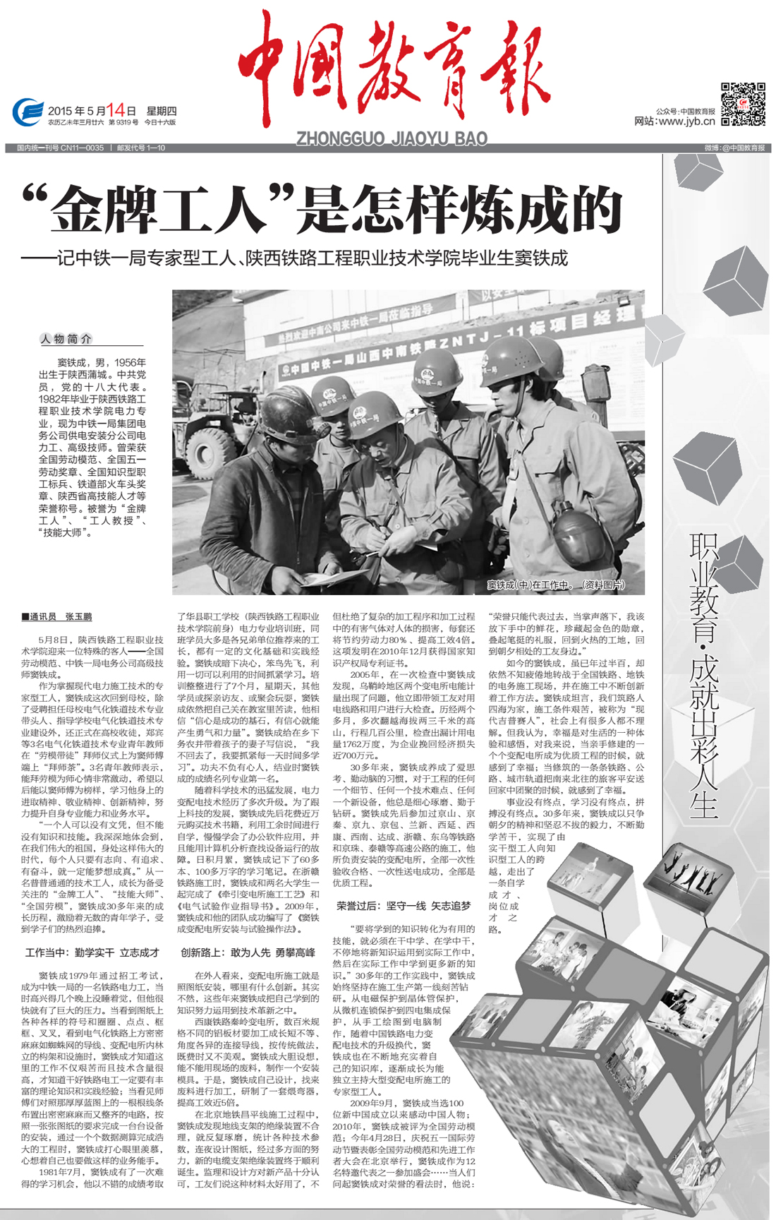 2015年5月14日中国教育报第10版题:“金牌工人”是怎样炼成的——记中铁一局专家型工人、陕西铁路工程职业技术学院毕业生窦铁成