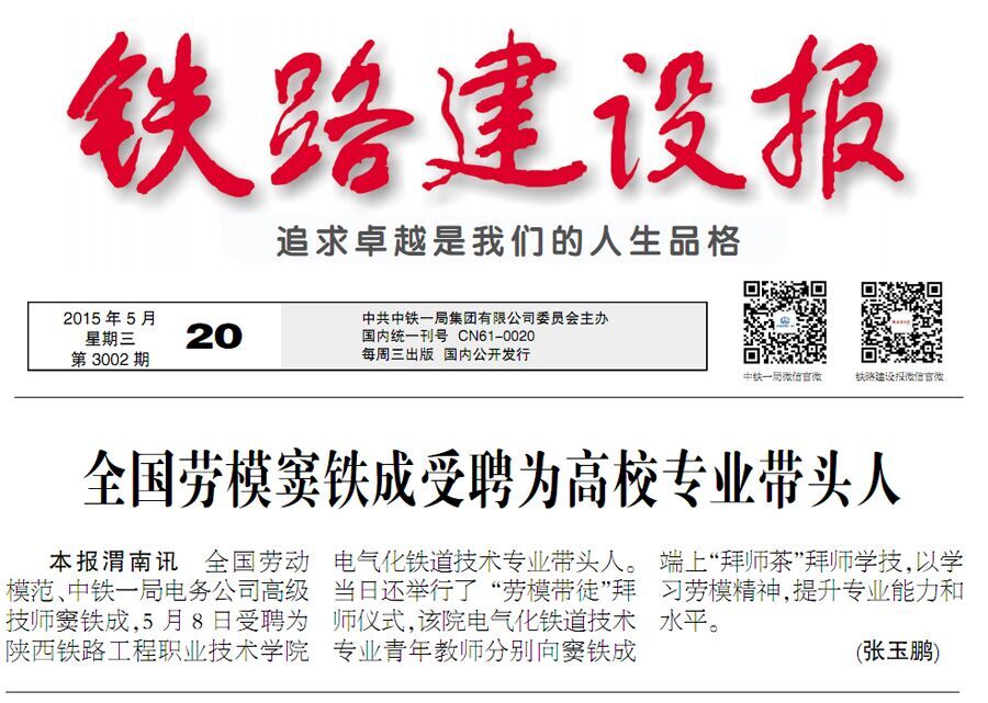 2015年5月20日铁路建设报头版题:全国劳模窦铁成受聘为高校专业带头人