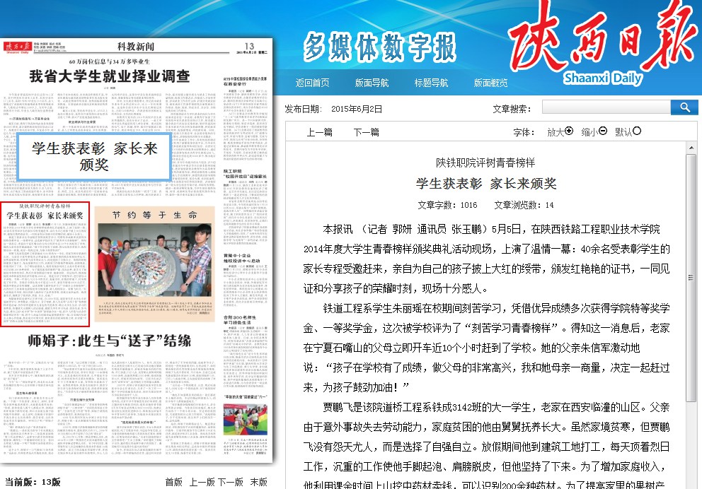 2015年6月2日陕西日报第13版题:学生获表彰 家长来颁奖
