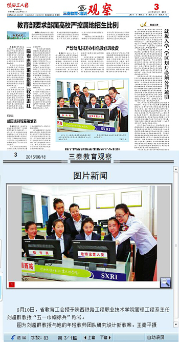 2015年6月18日《陕西工人报》第三版图片新闻:刘超群获省教育工会“五一巾帼标兵”称号