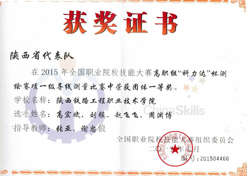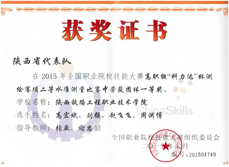 6月19日,从全国职业院校技能大赛高职组“科力达杯”测绘赛项组委会传来喜讯,陕西铁路工程职业技术学院代表队分别以二等水准测量赛项第一名和一级导线测量赛项第三名的优异成绩喜获两个项目团体一等奖,测绘工程系谢忠俍、张亚两位老师分别获得优秀指导教师奖。测绘工程系高宏斌、周渊博、刘强、赵飞飞4名参赛学生获得由国家测绘地理信息局职业技能鉴定中心颁发的工程测量员三级(高级测量工)职业资格证书。