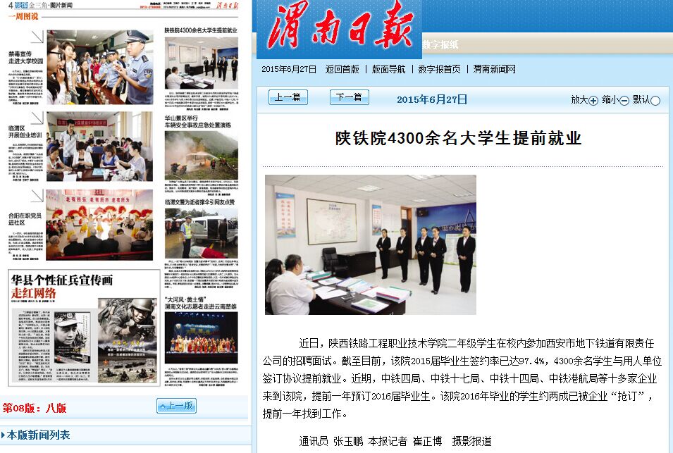 2015年6月27日渭南日报第8版题:陕铁院4300余名大学生提前就业