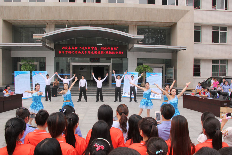 7月3日下午,由学院与西安车务段联合举办的,渭南火车站进校园——陕铁院专场活动在学院临渭校区A楼广场举行。 渭南客运站针对高校大学生毕业离校回家、赴单位报到客运出行高峰期之际,将行包邮寄、托运和售票地点设在校园内,为大学生提供便捷服务。同时为学院物流管理、铁道交通运营管理专业的学生进行行包托运和售票技能等展示和培训,活动吸引了全院各专业学生,收到良好效果。(姚天魁) 活动现场