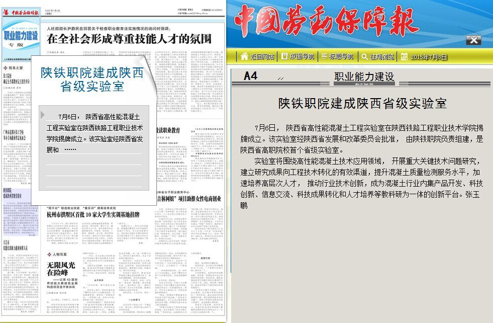 2015年7月8日中国劳动保障报第4版题:陕铁职院建成陕西省级实验室