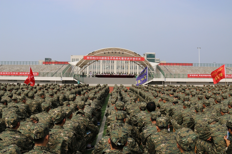 9月7日上午,陕铁院2015级新生开学典礼暨军训开营仪式分别在临渭和高新校区举行。院党委书记王晖,院长王长友,党委副书记车绪武,党委副书记、纪委书记杨云峰,副院长王闯、焦胜军、李林军,承担本次军训任务的中国人民解放军63785部队副站长闫鹏、技工训练队教导员李闯方及参训教官出席典礼,学院相关部门负责人及全体2015级新生参加典礼。