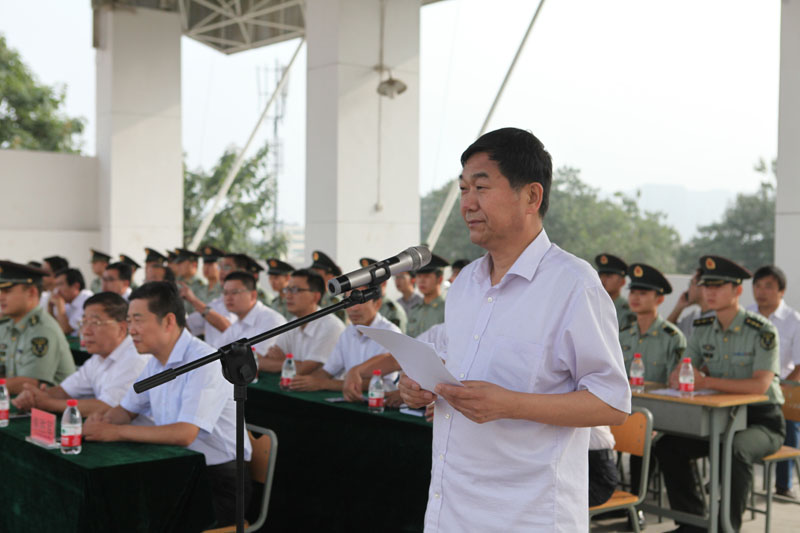 军训开营仪式上,王晖向军训团授旗,标志着2015级新生军事训练活动正式开始。