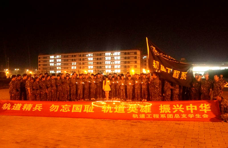 轨道系的学生与蜡烛分别排列成“九·一八”图形来纪念“九·一八”事变84周年,同学们“勿忘国耻、振兴中华”的高呼声和着渭南市“九·一八”警报声在渭南市上空、在人们心中久久回荡。(李鸿彬/文 杨光/图)