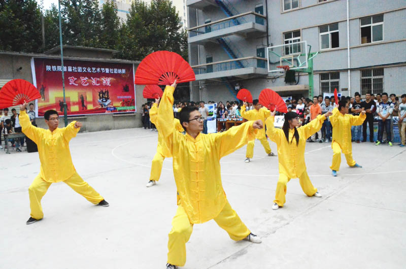 9月23、24日,由大学生社团联合会举办的陕铁院首届社团文化艺术节暨社团纳新文艺汇演在临渭和高新校区举行。 艺术节上,学院58个学生社团采用丰富的宣传方式开展纳新活动,军乐团、战车轮滑协会、舞狼街舞队、护校队、龙搏跆拳道协会、太极协会等社团表演了特色、多彩的文艺节目。艺术节的举办既展示了各个社团的风采,又加强了社团之间的沟通交流。