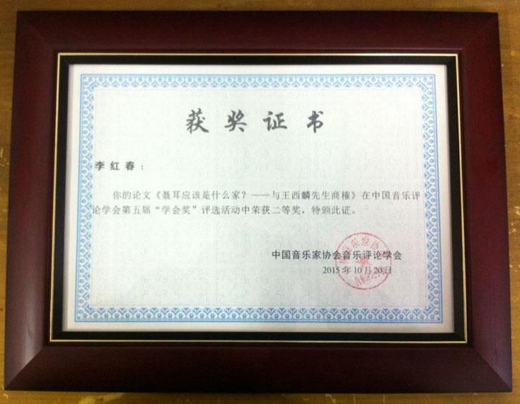 本届比赛,吸引了中央音乐学院、上海音乐学院等十大音乐学院及众多综合性大学音乐系专职教师和在读博硕研究生参加,收到稿件1000余篇,经过长达11个月的匿名初审、专家复审、主席团终审三个阶段的评审,共评出一等奖3名,二等奖5名,三等奖8名。李红春撰写的《聂耳应该是什么家——与王西麟先生商榷》一文从音乐作品艺术体裁的相互关系、中国悠久的线性音乐思维传统、非学院派的音乐家之社会地位、音乐家的艺术责任和历史使命四个方面,对中国革命音乐先驱聂耳的职业角色和社会身份进行了深入的辨析与论述,最终以82.3分的优异成绩荣获二等奖,成为西北五省区唯一获奖者,也是全国范围内高职院校的唯一获奖者。