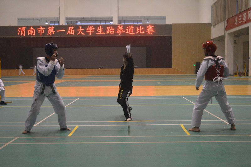 12月9日下午,陕铁院建筑工程系龙博跆拳道协会在高新校区文体中心举行了“渭南市第一届大学生跆拳道比赛”。学院龙博跆拳道协会、渭南师院礼博智仁跆拳道协会、渭职院跆拳道协会参加了比赛。比赛期间,学院党委副书记车绪武莅临赛场指导。铁道工程系、测绘工程系、建筑工程系、轨道工程系、学生处等部门负责人参加开幕式。
