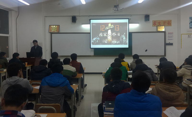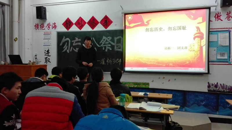 活动中,同学通过PPT介绍,详细地了解国家公祭日的由来、目的和意义。并通过相关影片视频,系统地回顾了那段不堪回首的历史,全体同学集体诵读《和平宣言》和“公祭鼎铭文”沉痛哀悼死难同胞,向英勇无畏的人民英雄表达崇敬之情。“落后就要挨打,只有祖国强盛,人民才能和平幸福”,同学们说。同时表示,要以史为鉴,继往开来,牢记国耻,奋发图强,立足自身,努力学习专业技能,为祖国铁路建设事业贡献绵薄之力,为实现中华民族伟大复兴添砖加瓦。活动最后,同学们集体起立,整理着装,为遇难同胞默哀,用无声语言寄托对逝者的哀思。
