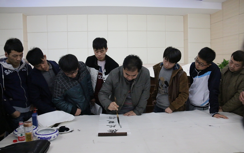 讲座临近尾声,两位书法家挥毫泼墨,现场示范,亲身为同学们展示了他们的书法艺术功底,赢得了同学们的声声惊叹。(李博/文 蔡林辰、张欣、王帅、樊帅旻/图)