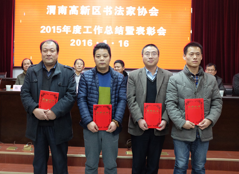 1月16日上午,渭南高新区书法家协会召开2015年度工作总结暨表彰大会。学院铁道工程系教师毛俊杰荣获该协会2015年度先进工作者。陕西省书法家协会副主席、渭南市书法家协会主席薛小虎、高新区党工委副书记谭文德为优秀社员和先进工作者颁发了荣誉证书。(毛俊杰) 颁奖现场