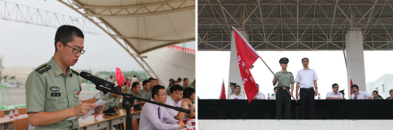 军训开营仪式上,王晖向军训团授旗,标志着2016级新生军事训练活动正式开始。