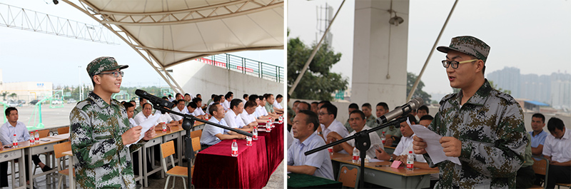 教官发言、向军训连授旗