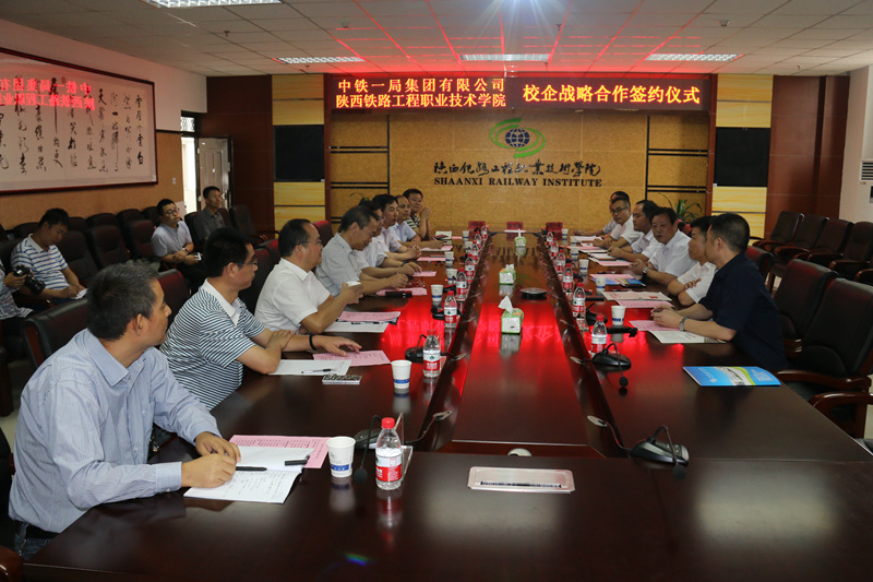 9月18日上午,陕铁院与中铁一局集团公司在高新校区三楼会议室举行校企合作洽谈会, 双方签订了战略合作协议。中铁一局集团有限公司总经理马海民,集团公司发展规划部部长樊卫勋,集团公司东北经营部总经理夏小刚,五公司总经理余维东,城建公司党委书记,总经理张鹏茂,秘书李文奇,以及学院党委书记王晖、院长王津,党委副书记车绪武,校企合作处、学生处、党政办 、科技处、教务处负责人出席会议。
