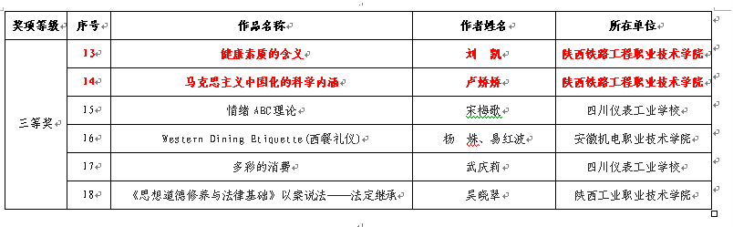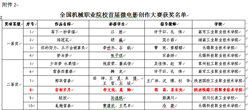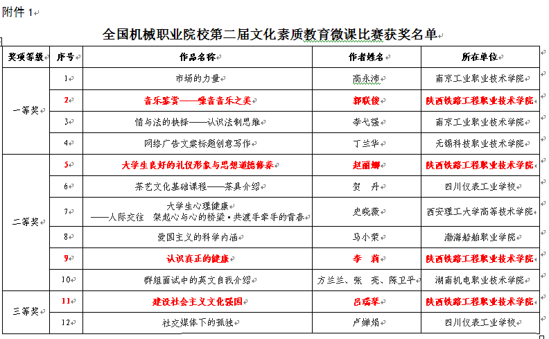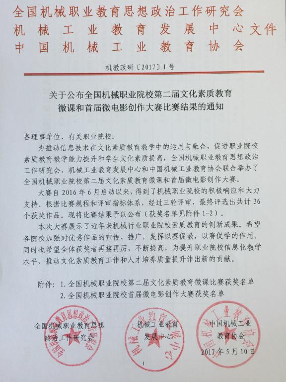 5月10日,全国机械职业教育思想政治工作研究会、机械工业教育发展中心、中国机械工业教育协会发布了《关于公布全国机械职业院校第二届文化素质教育微课和首届微电影创作大赛比赛结果的通知》(机教政研〔2017〕1号),陕铁院荣获一等奖一项、二等奖两项、三等奖三项和微电影创作二等奖一部等多项奖励。 此次比赛根据比赛规程和评审指标体系,经过三轮评审,在众多参评作品中共评选出36个获奖作品,其中陕铁院获奖作品达到7个之多。(张立保)