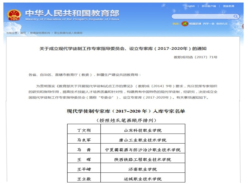 近日,教育部下发《关于成立现代学徒制工作专家指导委员会、设立专家库(2017-2020年)的通知》(教职成函〔2017〕71号)文件,学院党委书记王晖教授入选教育部现代学徒制工作专家指导委员会专家库。