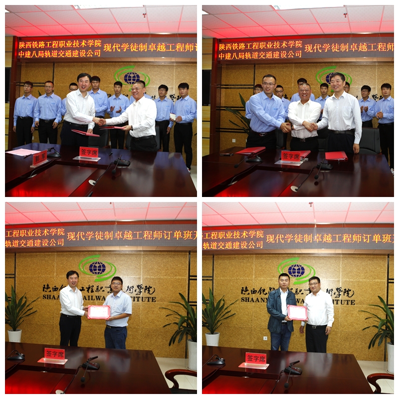 会上还举行了签约仪式。王津向企业师傅及企业班主任颁发聘书,公司人力资源部经理宋海争向院内订单班班主任颁发聘书。王津代表学院与中建八局轨道公司签订了现代学徒制卓越工程师培养校企合作协议。焦胜军代表学院与中建八局轨道公司及学生签订了现代学徒制学徒与学校、企业三方协议。