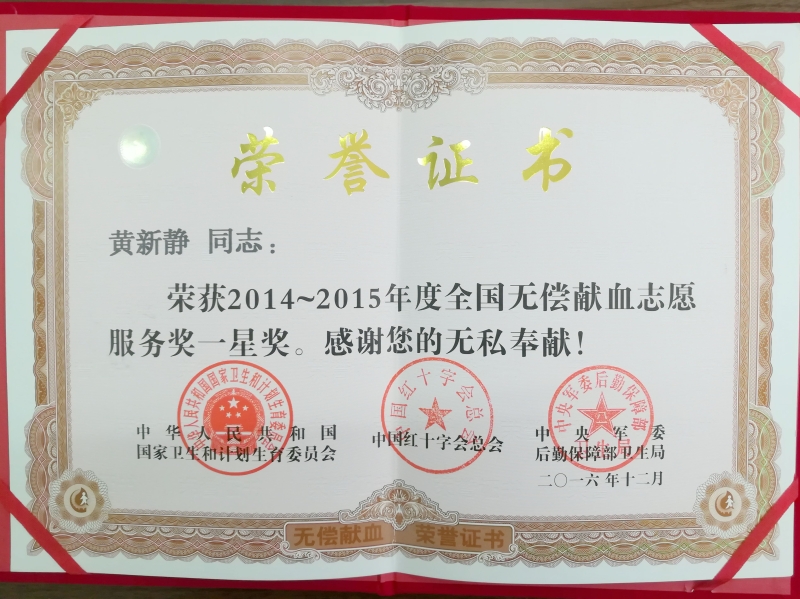 该奖项是由国家卫计委、中国红十字会总会、中国人民解放军总后勤保障部卫生局联合评选,每两年在全国范围内评选一次,此项表彰不仅是对黄新静长期参与无偿献血志愿服务活动的肯定,更是对学院无偿献血志愿者的极大鼓励。(陈莎莎)