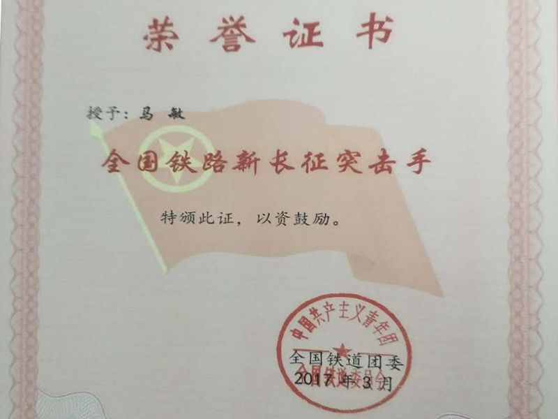 马敏荣获“全国铁路新长征突击手”荣誉称号