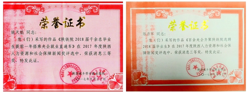 获奖证书近日,2017年陕西省人力资源和社会保障好新闻奖评选活动揭晓。由学院教师陈彦军、姚天魁采写的作品《百余央企齐聚陕铁院选聘2018届毕业生》荣获消息类三等奖。学院历来重视毕业生就业工作,毕业生就业率连续多年保持在98%以上,且毕业生90%左右在中国中铁、中国铁建、中国交建、各铁路运营管理局等大中型国有企业就业。高就业率、高就业质量在国内各媒体多次报道。(牛新平)