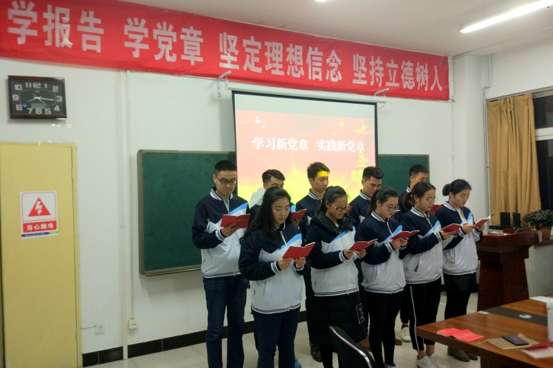 该系学生工作党支部全体党员也对新党章《总纲》进行了认真研读,大家手捧鲜红的新党章,齐声诵读“党员必须履行的八项义务”,提示自己:“不忘初心、牢记使命”。
