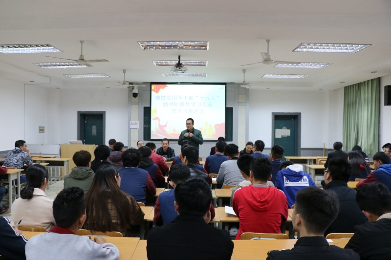 团委副书记侯峰结合《共青团中央关于全团认真学习宣传贯彻党的十九大精神的通知》(中青发〔2017〕18号)和《院团委关于开展“学习贯彻十九大精神不忘初心牢记青年使命”主题教育活动的通知》(陕铁院团〔2017〕14号)等通知要求,就学院团学组织学习宣传贯彻十九大精神作了动员部署,并对下一步的推进学习提出了具体要求。他强调,各级团学组织要全方位推进学习宣传十九大精神,进一步把带头学习好、主动宣传好、扎实贯彻好十九大精神作为今后一个时期的首要政治任务,他要求各级团学干部要在用十九大精神指导理论联系实际上下功夫,要在带领广大团员青年多形式、全方位深入学习十九大精神上下功夫,要在用习近平新时代中国特色社会主义思想武装头脑、统一思想、践行信仰,为实现“两个一百年”奋斗目标和实现中华民族伟大复兴的中国梦进程中汇聚青春力量上下功夫。