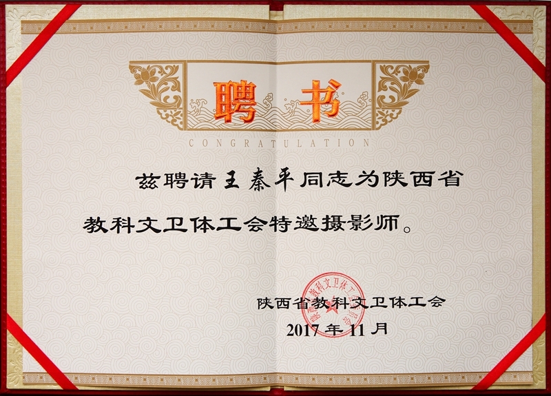 聘书11月23日,陕西省教科文卫体工会在西安华浮宫召开一届一次全委会,陈建树主席亲自向学院退休干部、陕西省摄影家协会会员王秦平颁发聘书,聘请其为陕西省教科文卫体工会“特邀摄影师”。此前,王秦平为陕西省教育工会特聘“首席摄影师”。(黄跃翔)