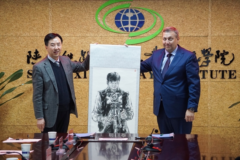 双方校长在会见期间举行了联合申办陕铁院—萨马拉交通学院战略框架协议,双方共同见证这一珍贵时刻。王津院长向客人赠送了学院艺术教育中心教师的书画作品和学院学生的剪纸作品。