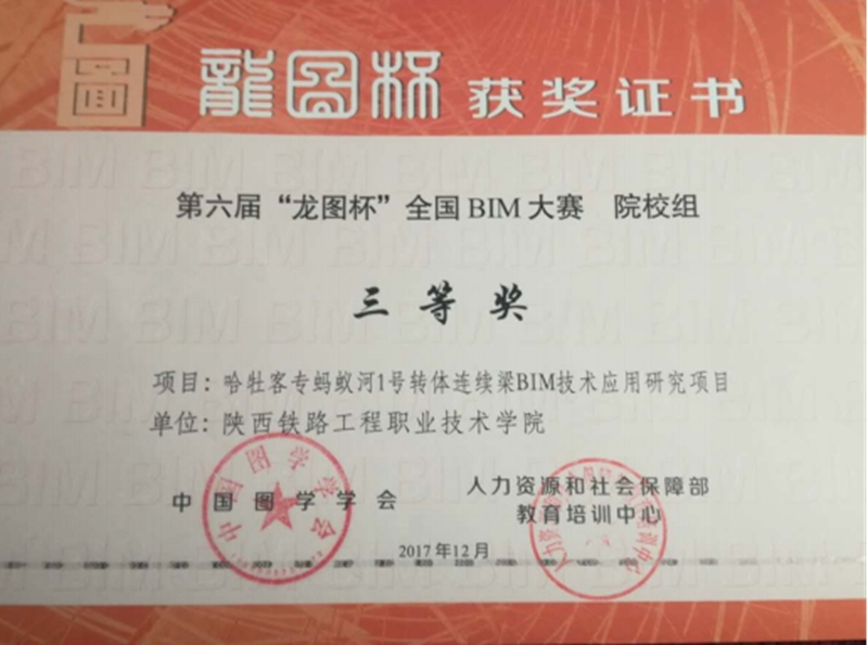 2017年12月16日,2018年“龙图杯”全国BIM大赛启动会暨第六届“龙图杯”全国BIM大赛颁奖典礼及高峰论坛在北京举行。由学院副院长王闯主持的,与中铁一局集团第二工程有限公司合作的哈牡客专蚂蚁河1号特大桥转体连续梁BIM项目,经过初审、复审、答辩、公示等环节,获得龙图杯大赛“院校组“三等奖。据悉,大赛分为设计、施工、院校、综合四个组,共有761项成果参赛,其中院校组设一等奖4项、二等奖8项、三等奖14项、优秀奖20项。