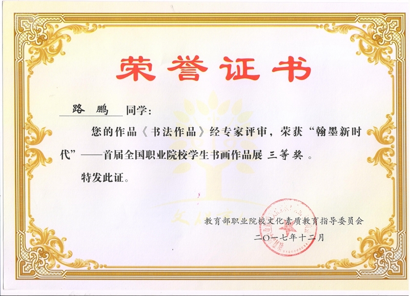 获奖证书为深入贯彻落实党的十九大精神,推动中华优秀传统文化的创造性转化与创新性发展,展示职业院校文化素质教育成果,教育部职业院校文化素质教育指导委员会近期举办了“翰墨新时代”——首届全国职业院校学生书画作品展。学院学生路鹏书法作品在本次作品展中荣获三等奖,李博老师荣获“优秀指导教师”称号。据悉,本届书画作品展共收到来自全国38所职业院校的260多幅学生书画作品,经专家评审,共评出一等奖10名、二等奖15名、三等奖25名。(党委宣传部)